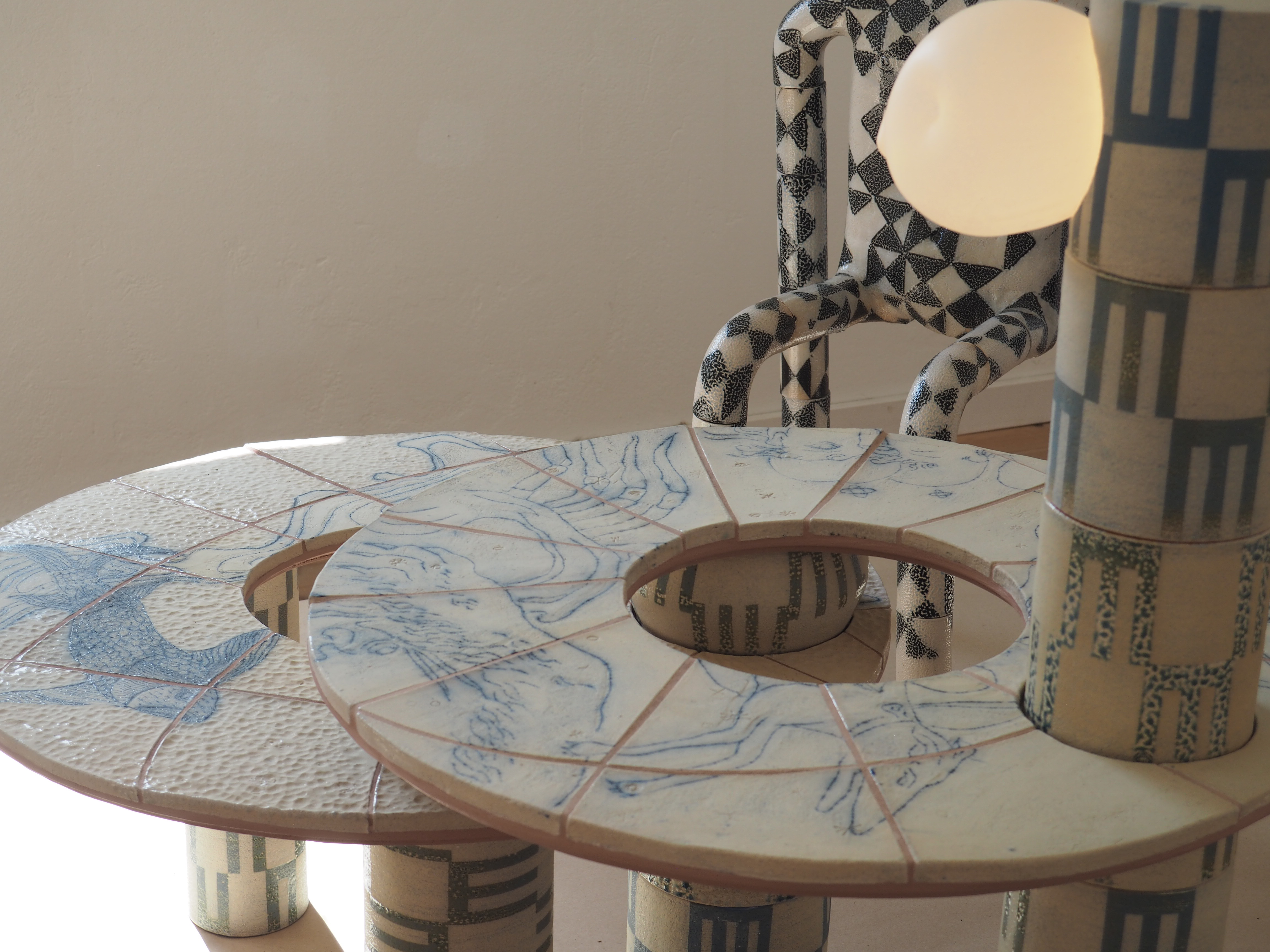 Medium: salt fired stoneware, blown glass, wood, steel, concrete, gesso + wax